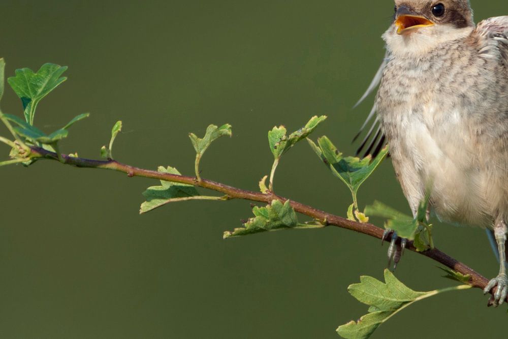 Red-backed Shrike ( Lanius collurio ), young bird, fledgling, sitting on a little twig, hedge, begging for food, full of joy, wildlife, Europe.