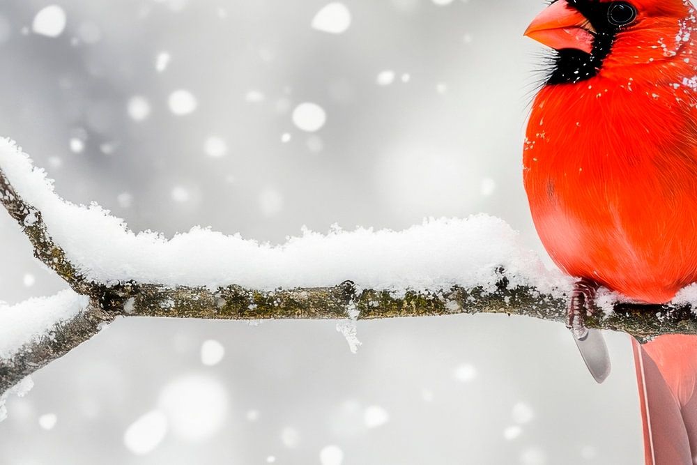 A bright red cardinal is perched on a snow-covered branch in the middle of a winter wonderland where delicate snowflakes gently fall. Its radiant plumage forms an impressive contrast to the icy stillness of the surroundings and adds a touch of vibrant colour and warmth to the scene. A little splash of colour in the winter wonderland!