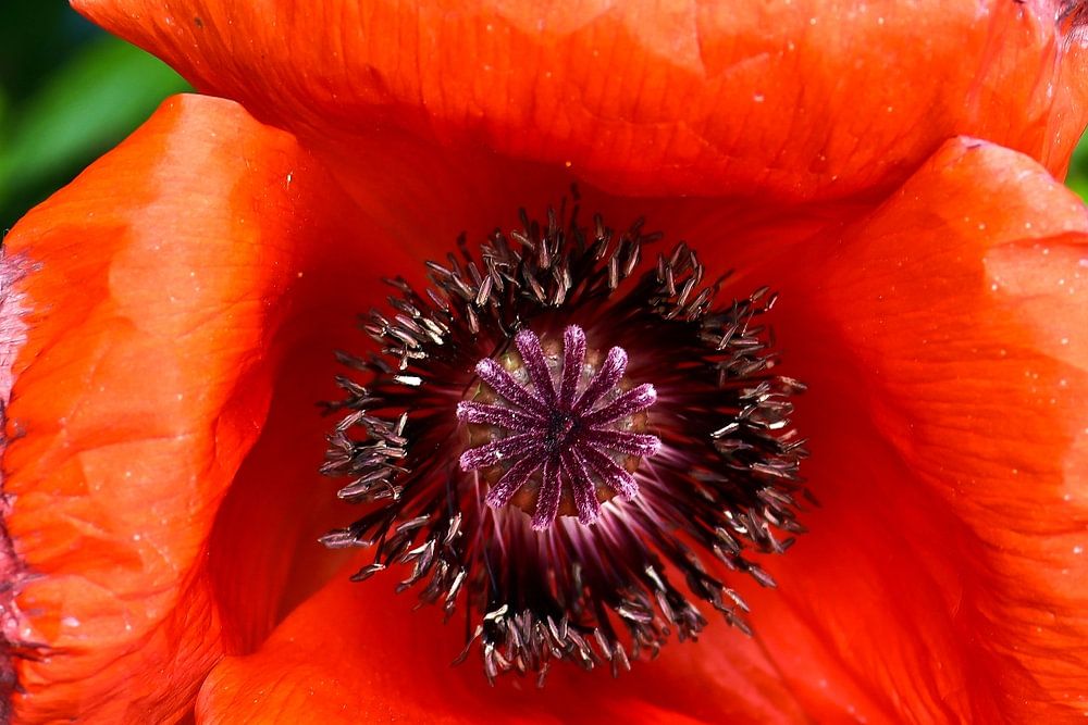 Red corn poppy flower against green background