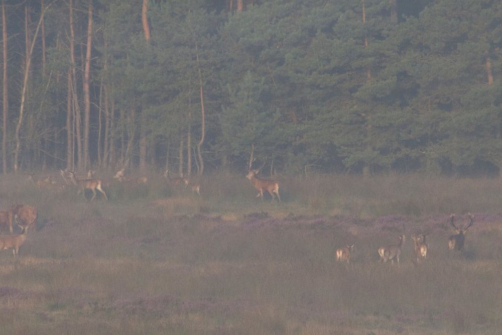 A group of red deer in the morning mist on the way from the moorland to the safe forest.