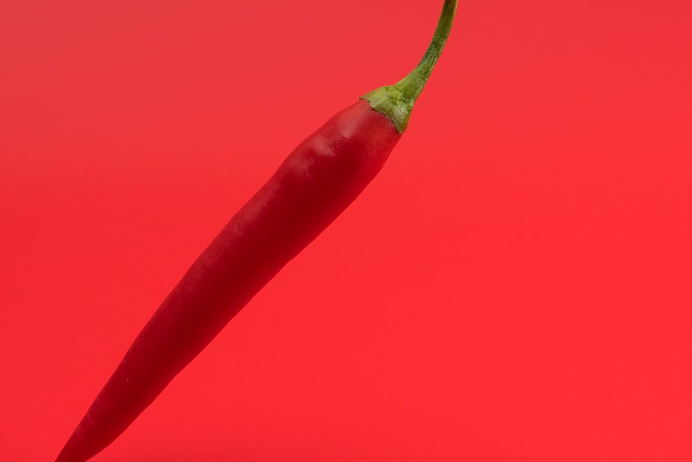 Studio photo of a spicy hot red pepper isolated on a red background.