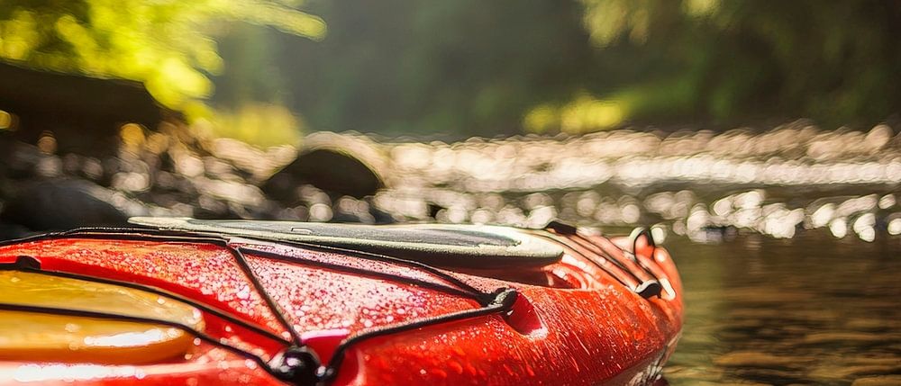 The gentle rays of light dance on the smooth surface of the water, while a bright red kayak in the foreground symbolises a spirit of adventure and freedom. Framed by lush greenery and rocky shores, this image exudes an inviting closeness to nature that fits perfectly in a living room or casual reading nook, where it inspires dreams of exploration.