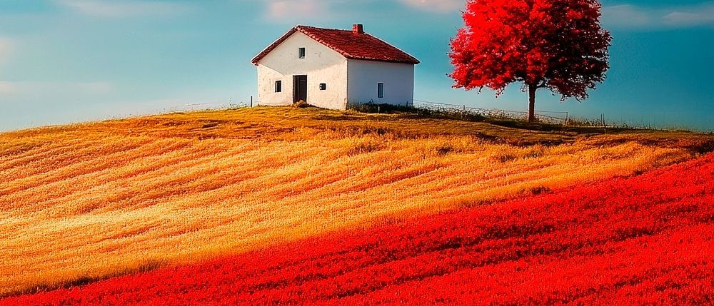 A glowing paradise opens up: a radiant house sits enthroned on gentle hills, surrounded by a sea of red flowers. The bright red tree attracts everyone's attention and lends the scene a mystical atmosphere. Perfect for the living room to create warmth and tranquillity - an eye-catcher that invites you to dream.