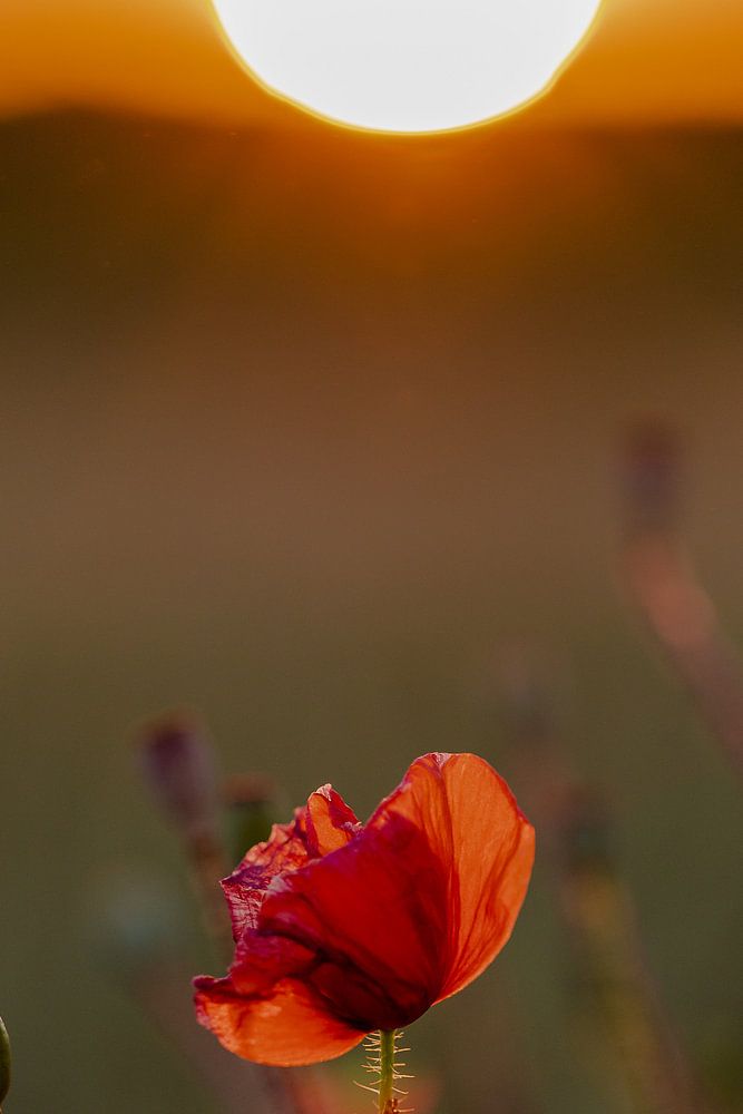 Red poppies in the field by a setting sun in summer during the golden hour. Which makes for a very warm photo on a cloudless summer evening that radiates peace and warmth in nature in a golden glow