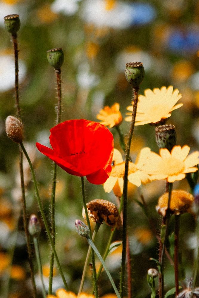 A red poppy in the middle of a field of wild flowers. Yellow, white and even small blue flowers can be seen. This photo was taken in the middle of the summer sun in the English countryside. A cheerful colorful print that looks good in any quiet interior that needs a little color.