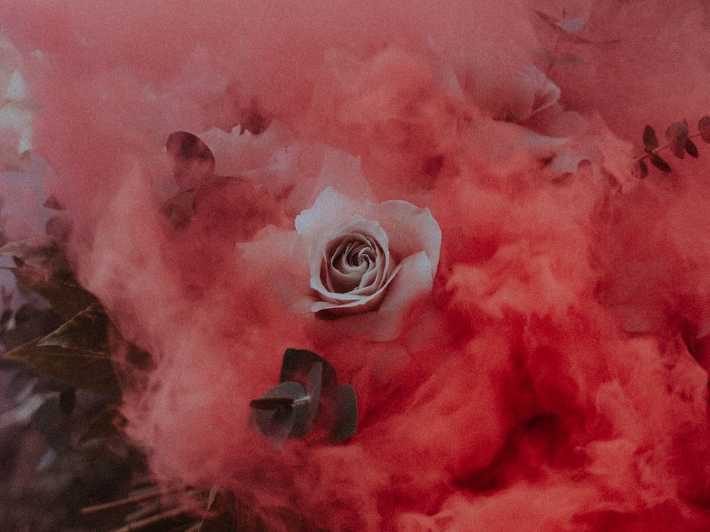 A fairy tale image. Red smoke covers the white rose. It gives a mysterious image.