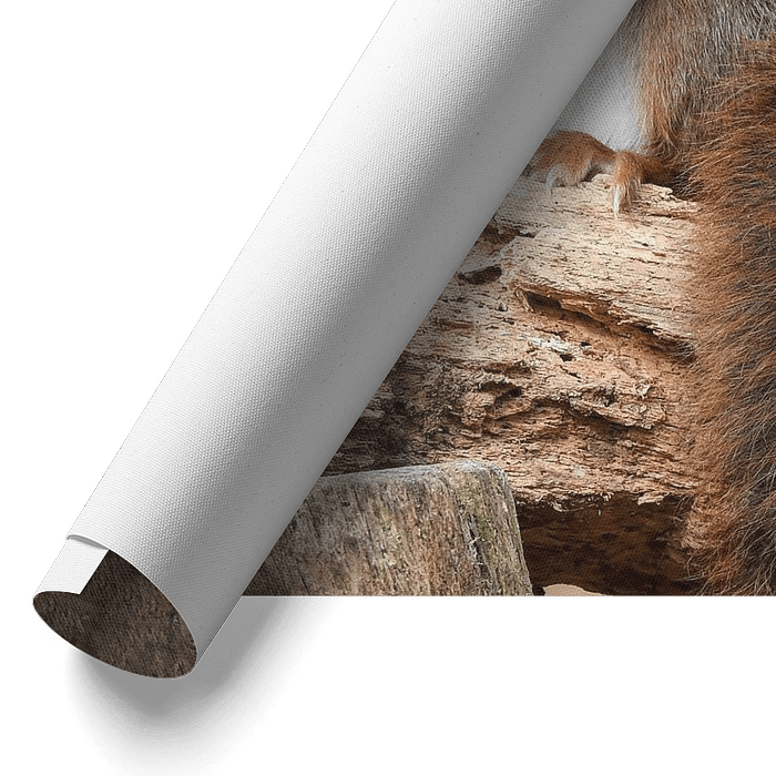 Photo of a cute red squirrel sitting on a branch with a nut in its paws