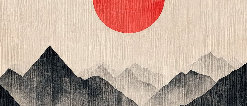 A majestic sunset over mystical mountains unfolds in soft, grey nuances, while the bright red sun makes the evening sky glow. This harmonious scene radiates calm and inspiration, perfect for a living room or office, where it promotes both cosiness and creativity.