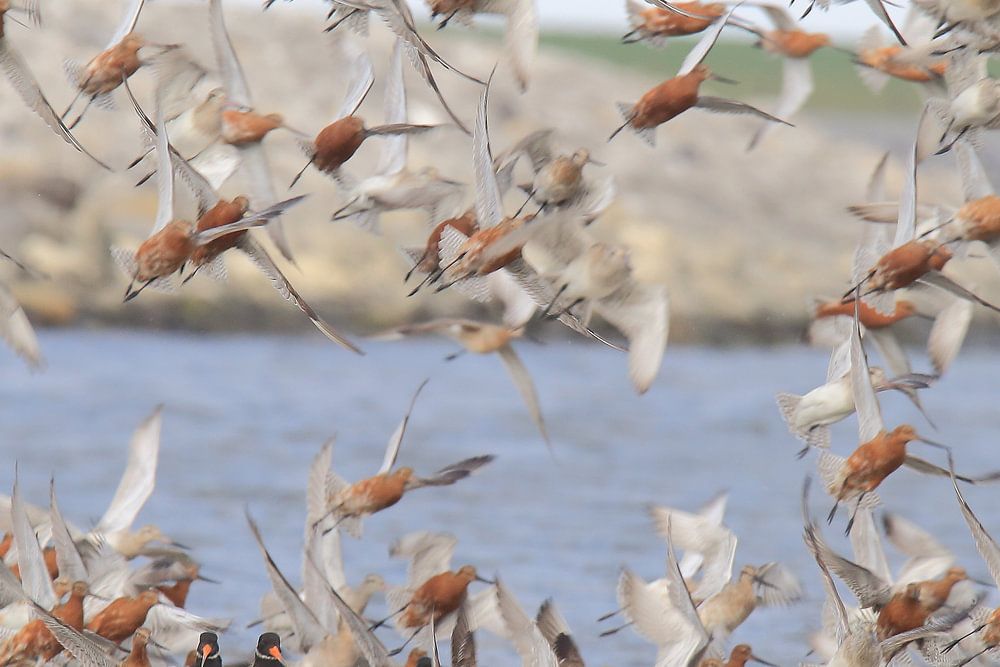 Red-tailed godwit, s on the mudflats, foraging on the mudflats before their journey to the far north begins.