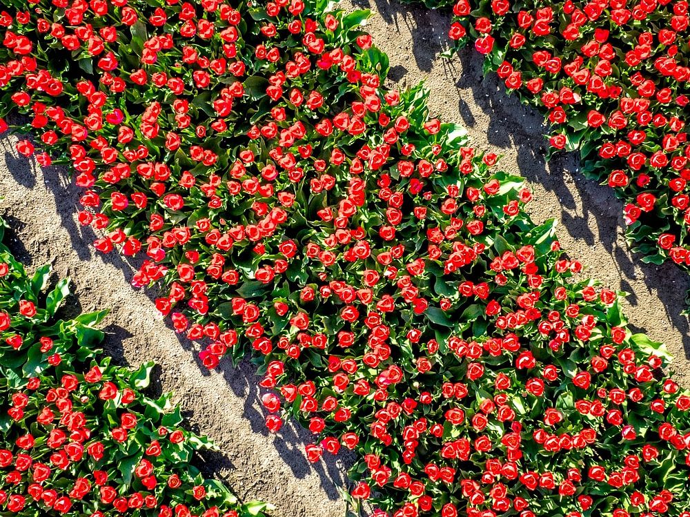 Tulips growing in agricultural fields with rows of wind turbines in the background in the Noordoospolder in Flevoland, The Netherlands, during springtime seen from above. The Noordoostpolder is a polder in the former Zuiderzee designed initially to create more land for farming.