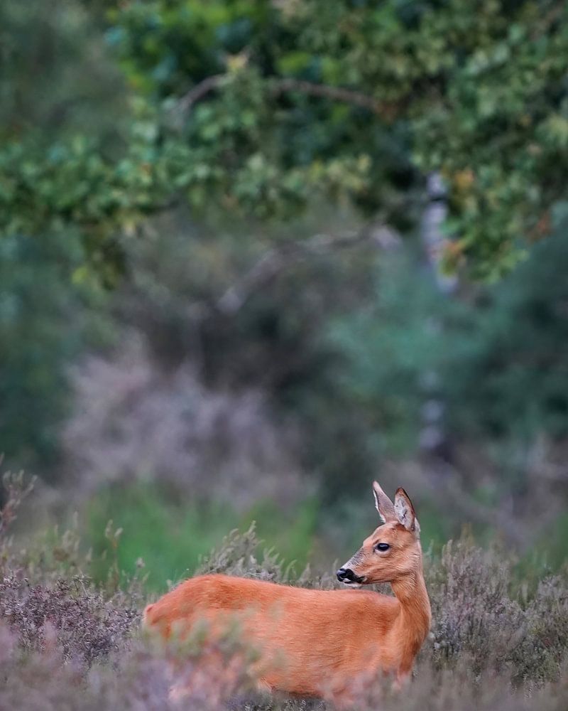 This gorgeous roe deer went to stand in exactly the right spot in the heathland. Sheltered yet very visible under a tree, I was able to take this picture. What a delight to see this in nature.