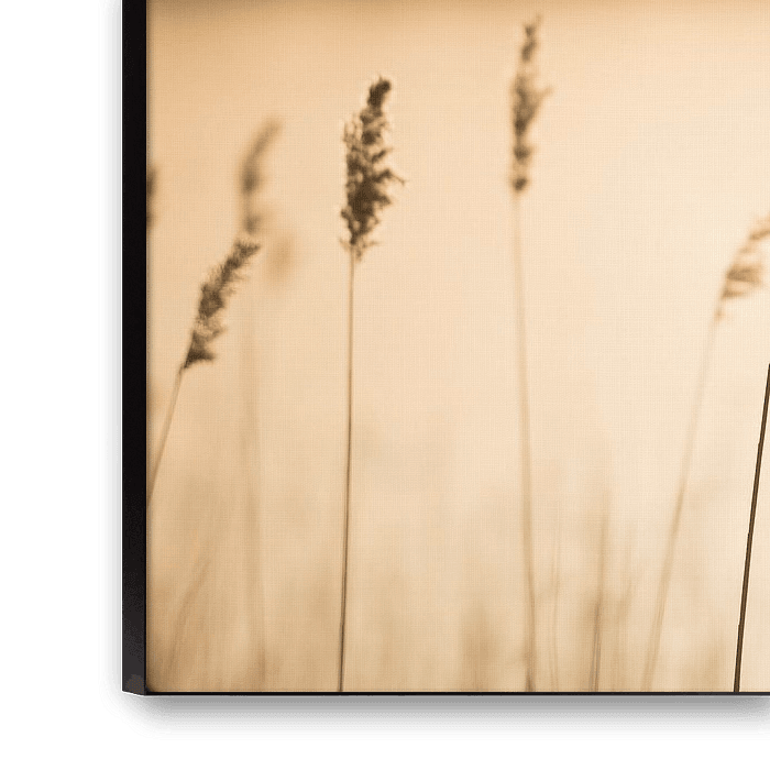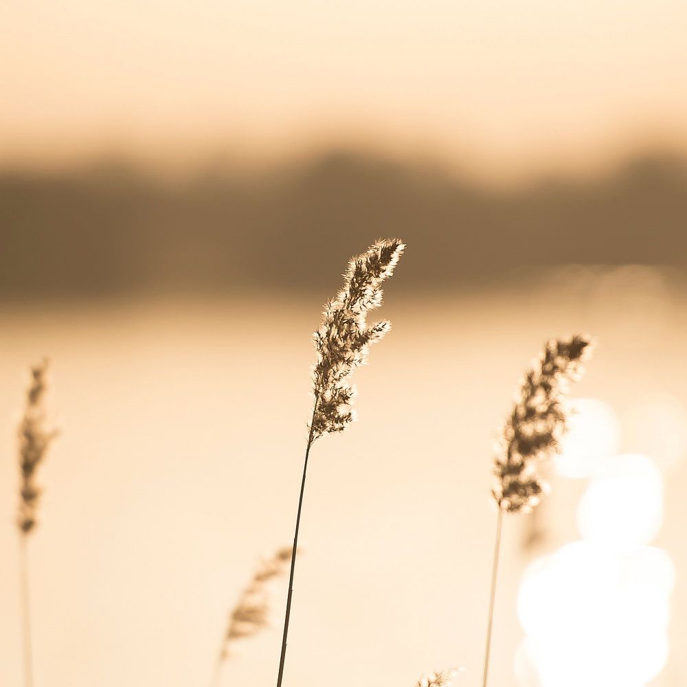 Gentle sunset at the lake with reeds and grasses in beautiful brown yellow okker beige orange and brown tones.