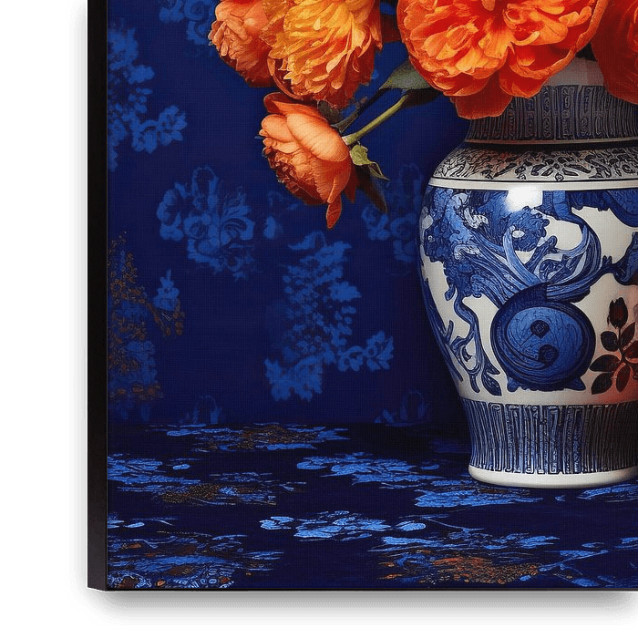 Refined Floral Splendour | Still Life Flowers - The painting shows a vibrant collection of flowers in a classic Delft blue vase, set against a rich blue background decorated with subtle floral patterns. The orange, white and blue tones of the flowers create a fresh contrast and convey a sense of luxury and sophistication. The…