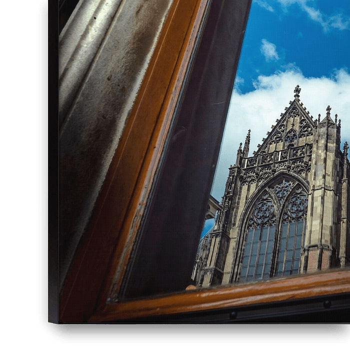 Blue sky above the cathedral in a reflection of a window of the university building on the Domplein in Utrecht