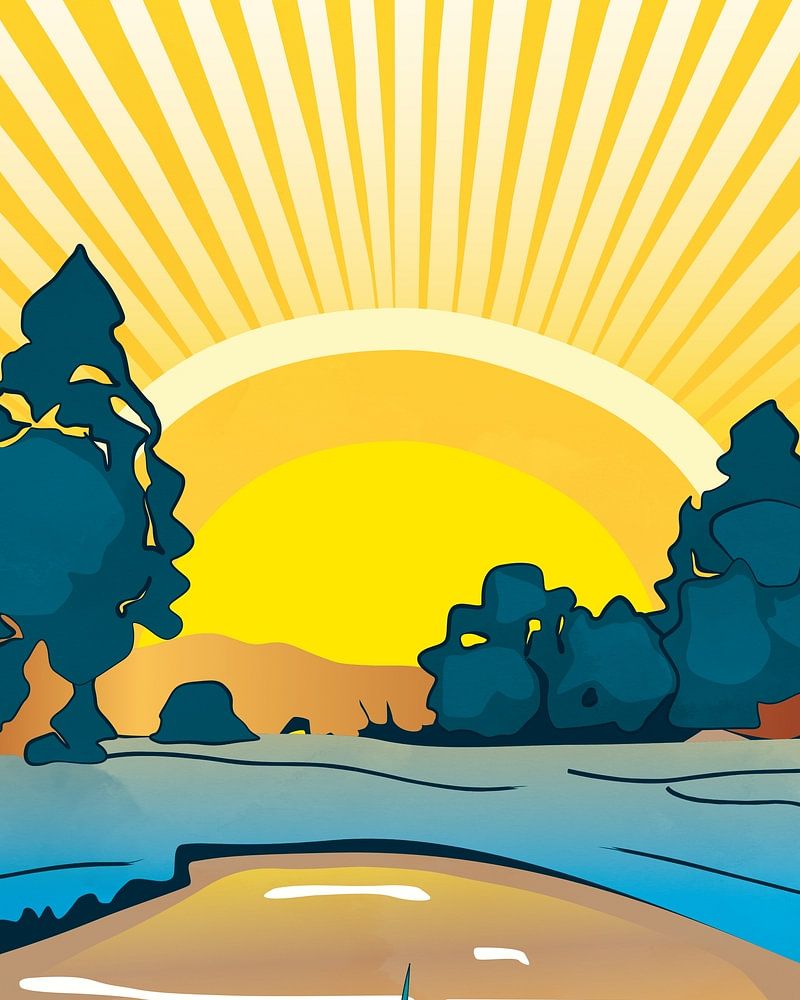 Abstract-minimalist retro-style landscape of the setting sun reflected in a pind among grassy fields.
