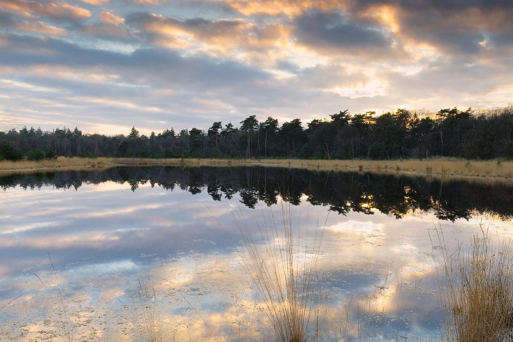 Sunset at moorland the Stippelberg near the Rips in Brabant. The clouds give a beautiful reflection in the water.