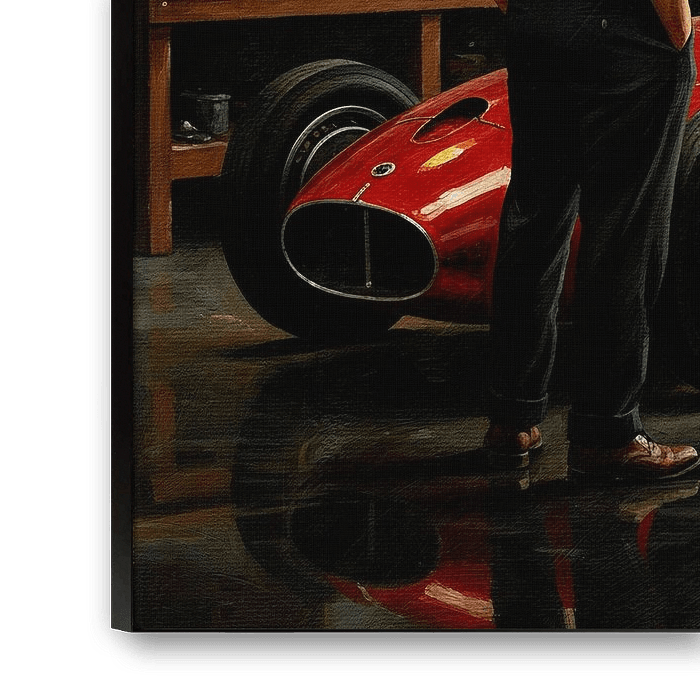 his piece captures a moment of quiet reverence in a vintage garage, where the past and passion for craftsmanship converge. The central figure, a man with his back turned, stands in contemplation before a striking red race car—a symbol of speed, elegance, and human ingenuity. His posture, hands in pockets, suggests a deep connection to the machine, perhaps as its creator, caretaker, or admirer.