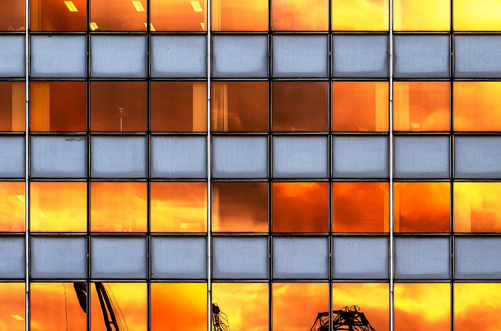 A picture of the 'Chiquita' building in Antwerp. This building is about to be demolished. Because of the orange glasses and a setting sun it looks like this building is 'on fire'.
