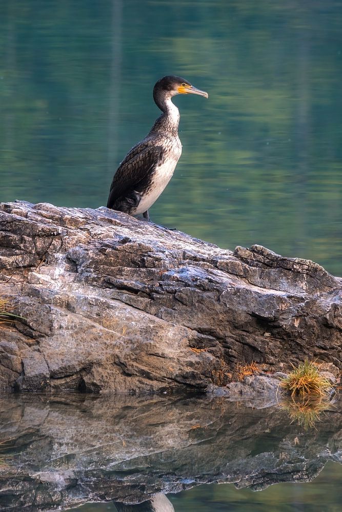 In the early morning stillness, a lone cormorant perched on a rocky outcrop, gazing out over the glassy lake. The water was so calm that the bird’s reflection appeared like a silent twin beneath it. With every breath, the world seemed to hold its own, and the cormorant, master of both air and water, waited patiently for the perfect moment to dive into the quiet depths below.