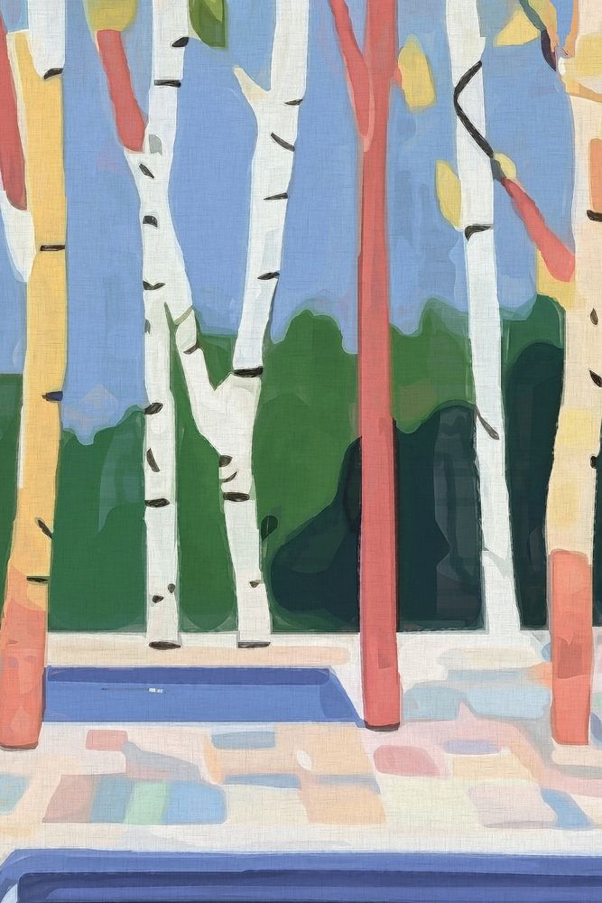 Reflections of birches in the pool No 2. It is a summer day and the birches on the terrace reflect in the main pool.The terrace consists of pastel-coloured tiles that complement the colours of the trunks and leaves of the birch trees.