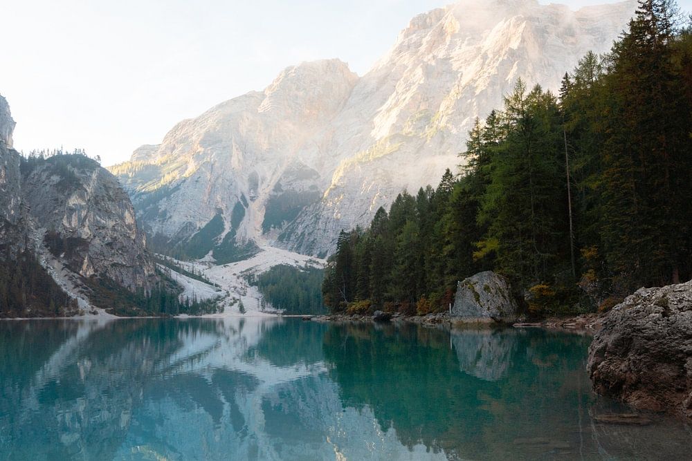 About "Reflections of mountain peaks in the beautiful blue-green mountain lake Lago di Braies"