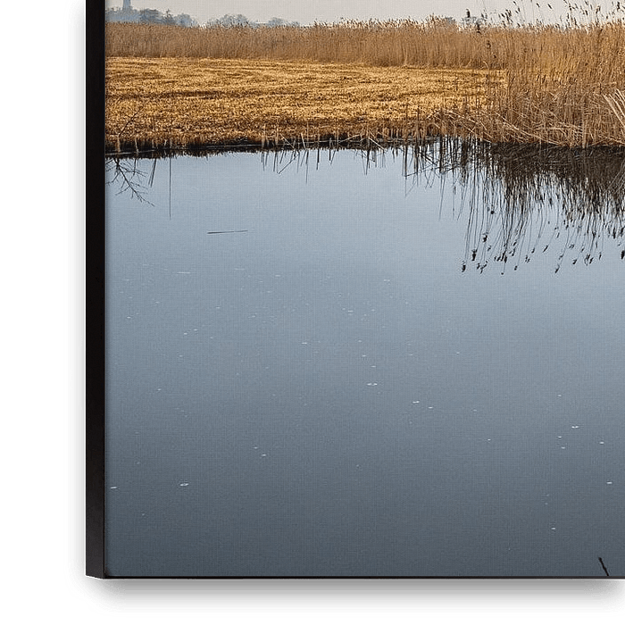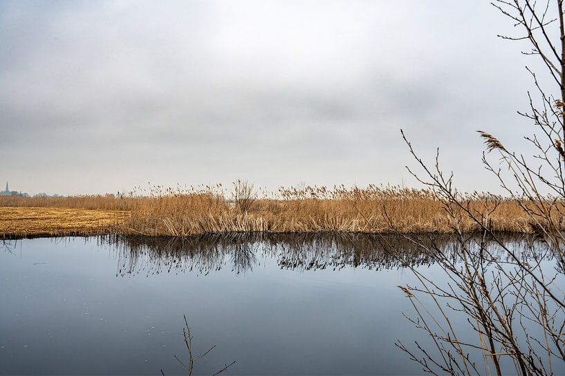 Beautiful landscape photograph of a section of the Nieuwkoop lakes, The somewhat grey skies and the golden yellow reeds reflecting in the blue-grey water. A truly Dutch scene.