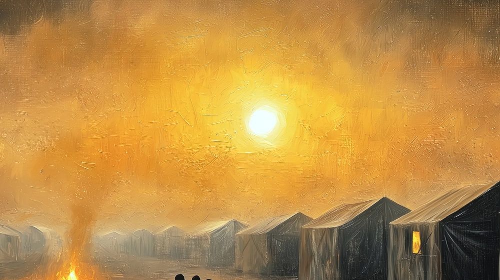 This emotional painting depicts the challenges faced by refugee families living in transit camps. Against the backdrop of a fiery sunset, the depiction reflects the hope, despair and sadness that often characterise the lives of those affected.