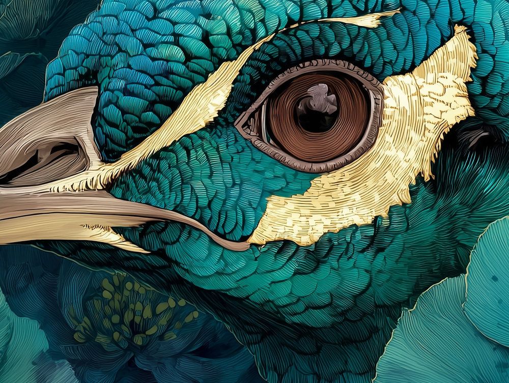 "Regal Bloom - Peacock in Floral Rust" depicts an ornate peacock head surrounded by delicate flowers in soft tones. The rich blue and green tones of the feathers contrast subtly with the floral frame, giving the work a sense of luxury and serenity. This artwork is ideal for interiors looking for a statement piece with natural elegance. Peacocks symbolise beauty, pride and inner strength