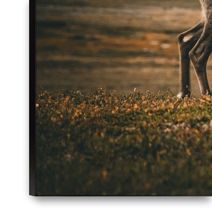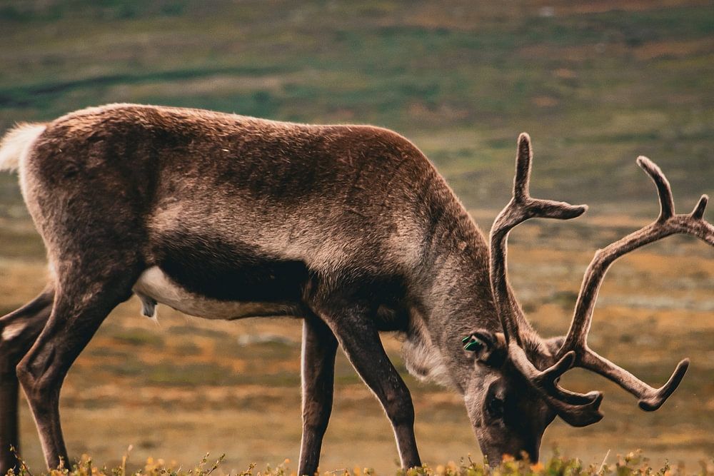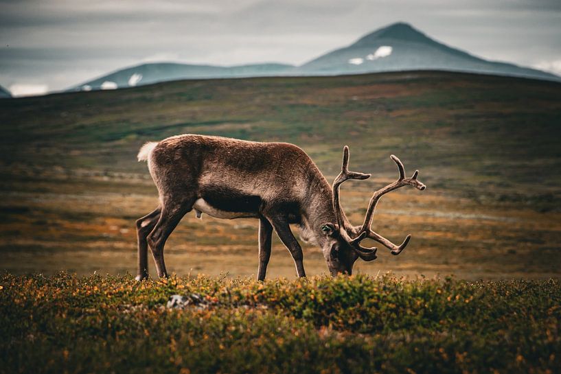 A grazing reindeer on the Flatruet plateau in the Swedish highlands. With its beautiful and impressive antlers and earthy coat, it almost blends into the landscape of rolling hills and quiet space.