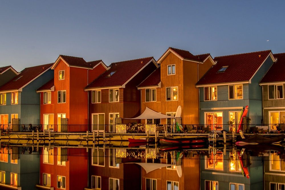 The little harbour of Reitdiep is adjacent to a residential area with beautifully coloured houses.