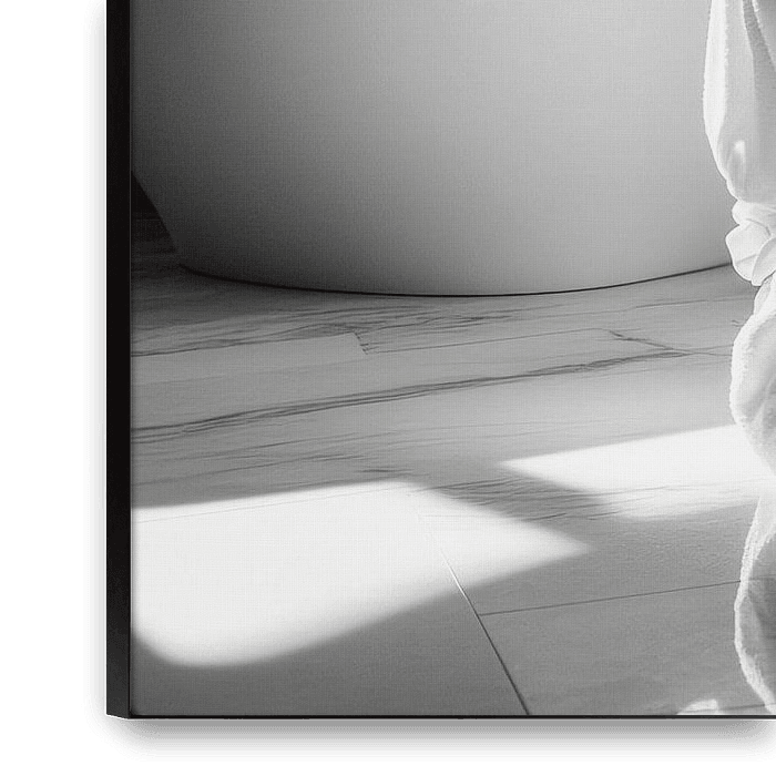 A calm, introspective scene shines in soft black and white tones. A woman, wrapped in a flowing dressing gown, enjoys a moment of silence with a cup in her hand. The warm rays of sunlight fall gently through large windows and accentuate the elegantly designed bathtub. This picture brings harmonious serenity perfectly into the bathroom.