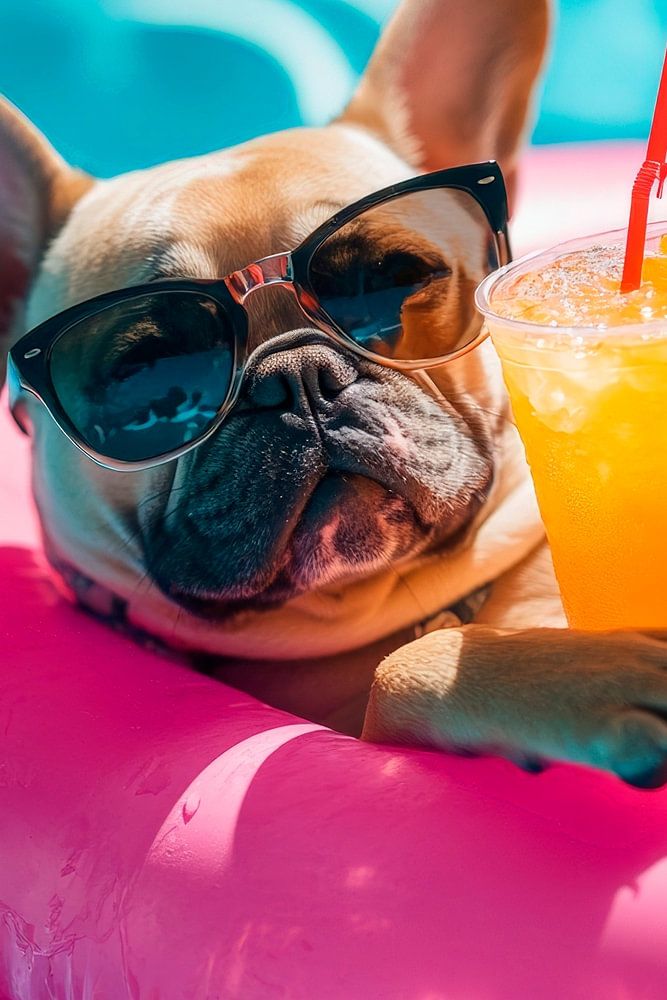 A charming picture showing a relaxed dog floating happily in a pink swimming ring in the sparkling water. With sunglasses and a colourful cocktail in his paw, he radiates pure holiday joy. This playful work of art is perfect for the living room or kitchen to add a touch of summer flair.