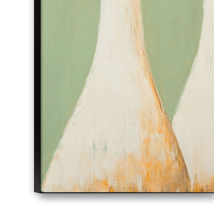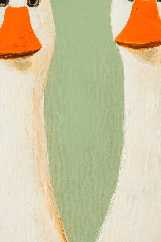 Two cheerful ducks catch the eye, their bright orange beaks conveying an inviting smile. With their large, black eyes, they seem to be gazing curiously at their surroundings. The soft, green background emphasises their lively appearance, while the simple, painterly design radiates a charming lightness.