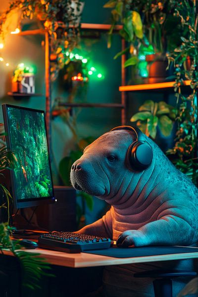 In a green oasis, surrounded by lush plants and soft light, sits a lively gaming friend. With wide, curious eyes, he intently watches the screen shimmer while his headphones sit perfectly on his ears. A harmonious picture of nature and technology, where the unusual finds its way into everyday life.