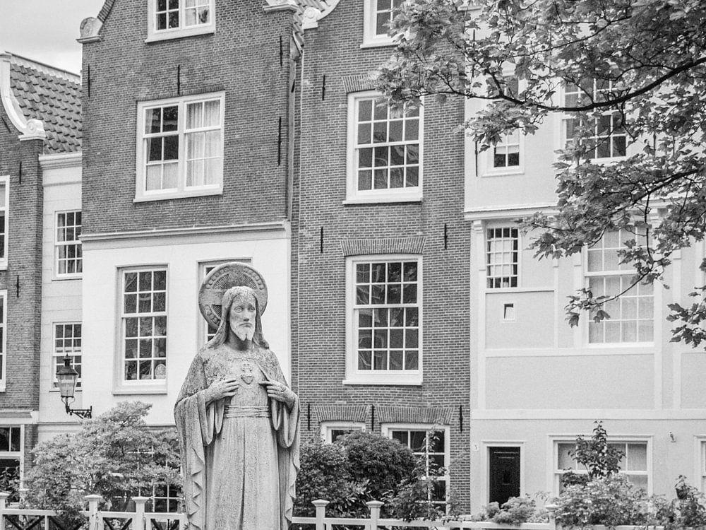 The Begijnhof is a tranquil oasis in the bustling centre of Amsterdam. The English Reformed Church (Engelsekerk) is at the centre of the courtyard, which is bordered by the busy Kalverstraat and Spui. The last Beguine died in 1971, and one sister was buried in a “grave in the gutter” that's still often adorned with flowers.