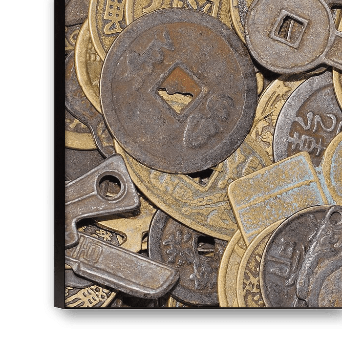 Buy the photo Remarkable shaped ancient Chinese coins on a flea market by Tony Vingerhoets on canvas, ArtFrame, poster and wallpaper, printed on demand in high quality.