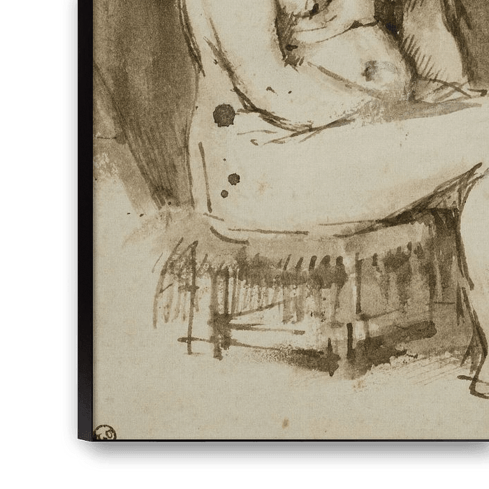 The girl sits naked on a low chair in this nude portrait, leaving her legs, hip, stomach and torso with breasts bared in the portrait.