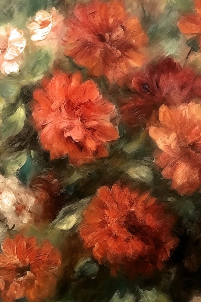 Red orange flowers in the style of French impressionist painter Pierre-Auguste Renoir.