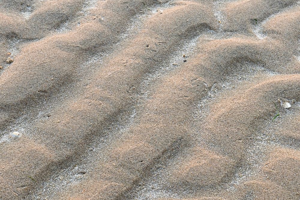 A detail shot of a stretch of beach that has just dried up. After the water has receded, structures remain in the sand. The repetition is broken by a print of a shoe sole. The warm light comes from the setting sun.