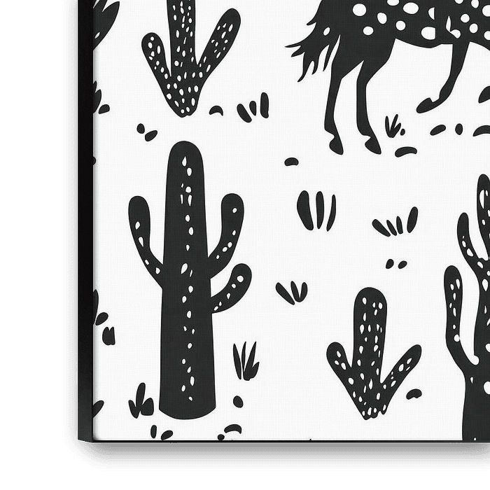 Playful repetitive work in cartoon style. girl with cowboy hat on a horse among cacti on the prairie. the work is repetitive, there is repetition in both the cacti and the cowgirl on the horse. The work is celebrated in black and white and is in western style. ideal artwork for a playful room or a tough young woman. Pop art work. the horse has coarse dots and the girl is in silhouette.