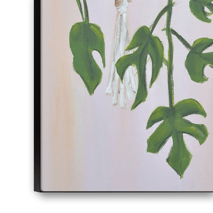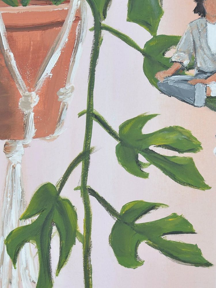 In Rest in Green, the viewer is invited to pause for a moment - to take a breath among the gentle interplay of nature and man. The painting shows a hanging plant in a simple, terracotta pot, supported by a white macramé holder. The graceful loops of the rope emphasise the delicate balance between firmness and lightness. The leaves hang leisurely down, their deep greens contrasting with the soft, pastel pink background that evokes a sense of warmth and stillness.