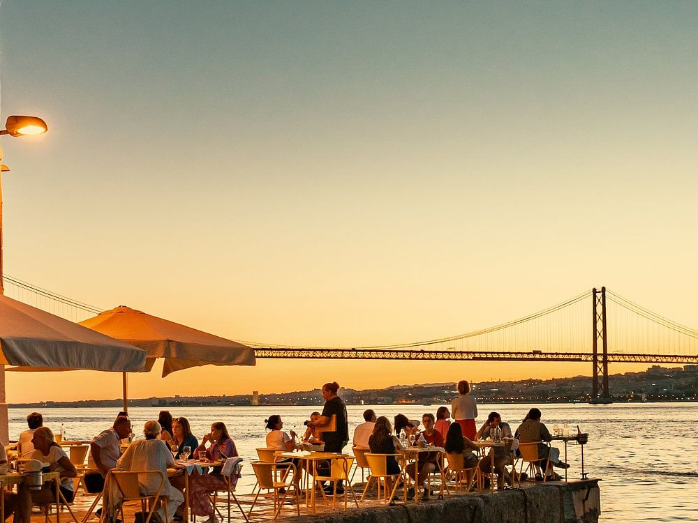 Atmospheric photo of the terrace of Restaurante Ponto Final in Lisbon on the waterfront, the Tagus River, with the iconic bridge and a boat just passing by in the background.