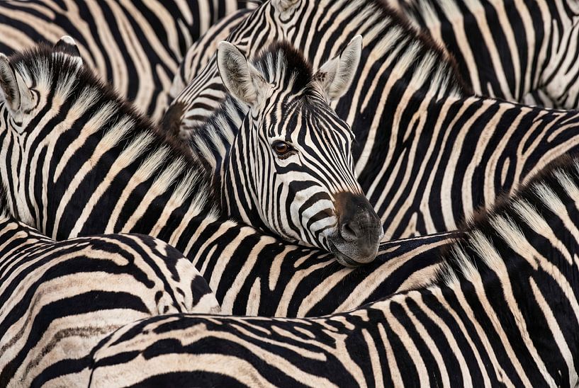 A peaceful group of zebras rests together, showcasing bold stripes.