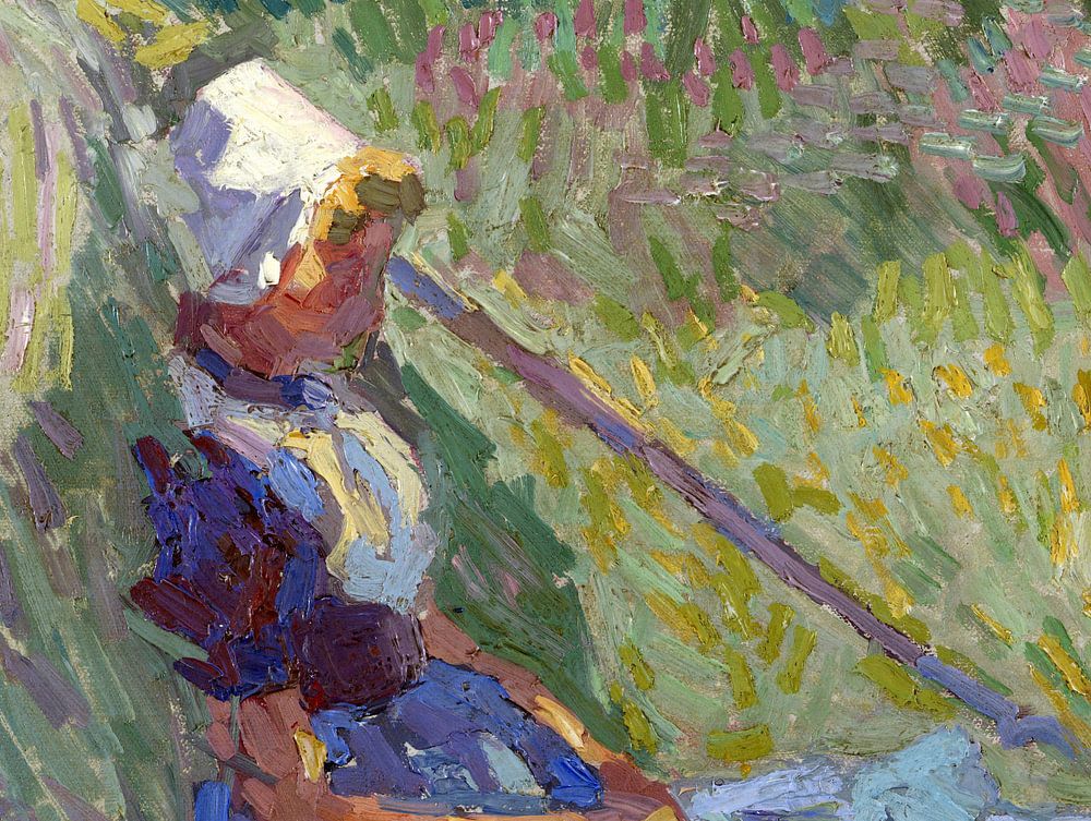 This peasant woman in traditional costume is resting against a mountain of hay or straw. Next to the maid lies her fork or pitchfork. The woman has wooden clogs at her feet.