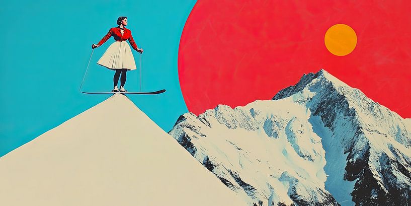 This artwork depicts a retro woman on skis, positioned on a mountain peak. The woman stands apart from her surroundings, yet at the same time forms a connection with the landscape. The composition consists of a mountain, a plane of sky and a circular shape that can be interpreted as the sun. These elements create an image that revolves…