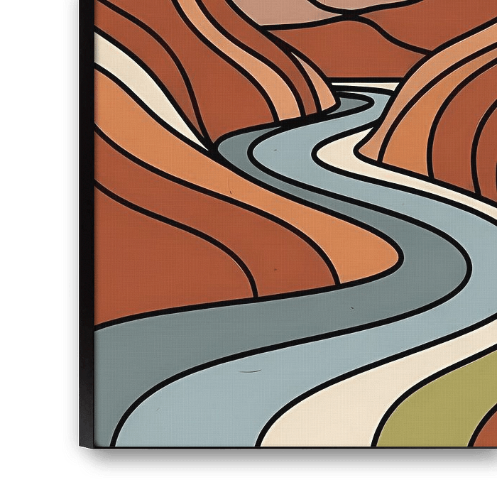 Immerse yourself in the tranquil beauty of this stylized landscape, where a winding river carves its path through majestic, layered canyons. The artwork captures a serene moment, perhaps a sunrise or sunset, with a minimalist sun peeking above distant, undulating hills. What stands out are the clean, flowing lines and bold color blocks, creating a distinct graphic aesthetic reminiscent of mid-century modern design or classic travel posters. The earthy palette of warm terracotta and burnt orange for the canyon walls beautifully contrasts with the cool blues of the river and sky, accented by soft greens and creams. This piece evokes the nostalgic feeling of a scenic road trip through an iconic desert valley, simplifying nature's grandeur into its essential forms. It conveys a profound sense of peace and exploration, inviting the viewer to pause and reflect. The artistic technique, with its striking outlines and flat, vibrant hues, gives the composition a timeless yet contemporary feel, almost like a meticulously crafted linocut or stained-glass window. Perfect for an interior seeking a blend of vintage charm and natural inspiration, this artwork radiates warmth and an adventurous spirit. It's more than just a landscape; it's a visual journey that will enhance any space, reminding you of the quiet beauty found in the world's ancient geological formations and endless horizons.