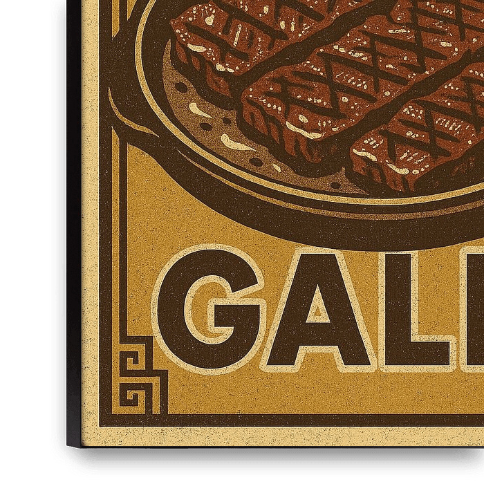 This Galbi poster highlights the smoky richness of Korean short ribs in a bold retro style. With its earthy golden tones, rising steam, and vintage Korean typography, the artwork recalls the nostalgia of old restaurant signs and food market posters. Galbi, grilled beef or pork short ribs marinated in soy sauce, garlic, and sesame oil,…