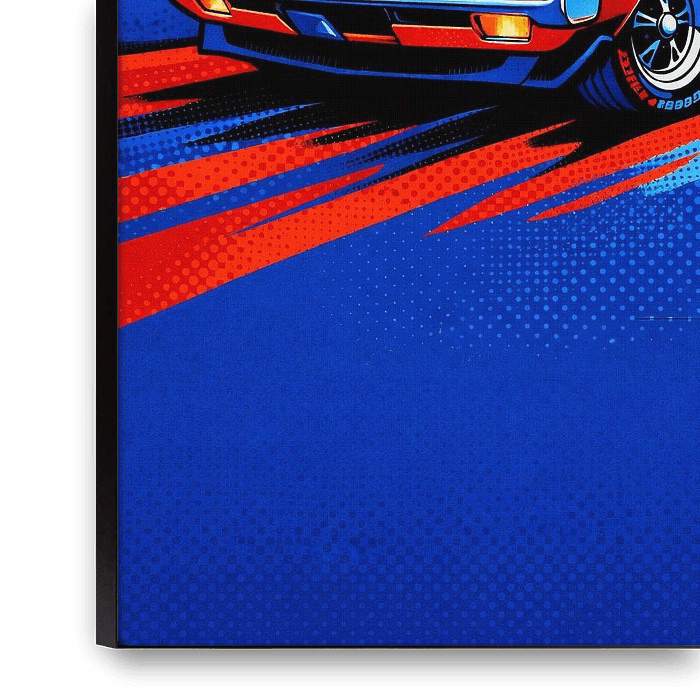 Bold 1970s muscle car illustrated in vibrant pop art style with striking red and blue contrast and halftone textures. A dynamic statement piece that captures speed, power, and vintage American automotive culture—perfect for modern living rooms, garages, or offices.