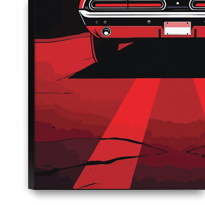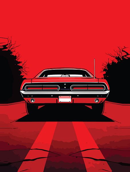 Energetic pop-art illustration of the aggressive rear of a classic red muscle car — wide stance, dual exhausts, rectangular tail lights and strong retro energy. High-contrast and powerful — heroic automotive art for modern walls that love classic muscle design and power.