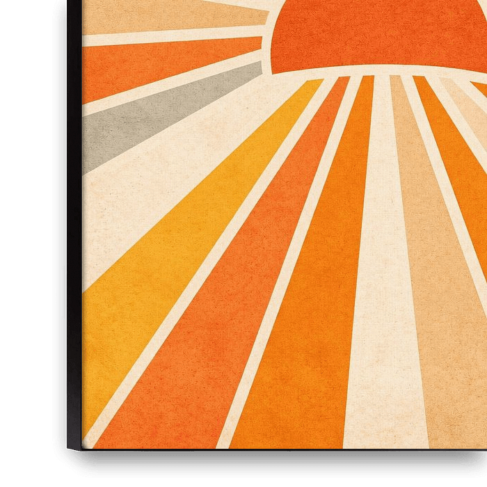 A warm retro-style sunburst artwork featuring bold radiating rays and a glowing sunset in vintage tones. This minimalist design captures the charm of mid-century modern aesthetics, perfect for brightening living rooms, bedrooms, or Scandinavian interiors.